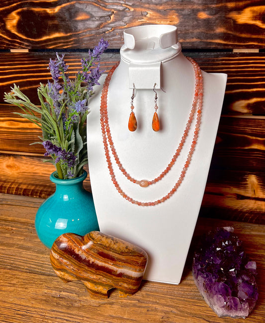 Sunstone Beaded Double Strand Necklace & Orange Coral Earring Set
