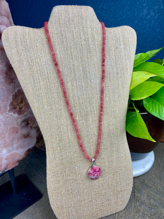 Thulite Pendant with Pink Jade Faceted Necklace