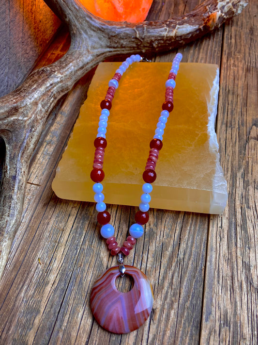Sunstone, Carnelian & Chalcedony Necklace w/ Agate Pendant