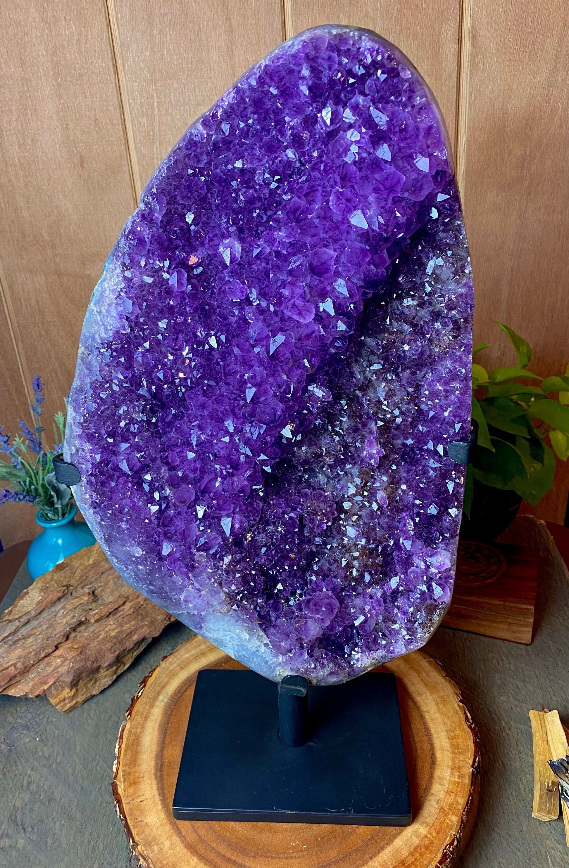 Amethyst (AM-eh-thihst) is a favorite stone for many gemstone fans. This type of quartz can come in shades of deep purple, pale lavender, and more, depending on traces of manganese and/or iron. According to Greek myth, Amethystos, a nymph, evaded the advances of Dionysus, the god of wine. Amethystos asked for help, and Artemis the virgin goddess changed her to a clear or white stone. Dionysus ended up pouring his wine over the stone, staining it purple.