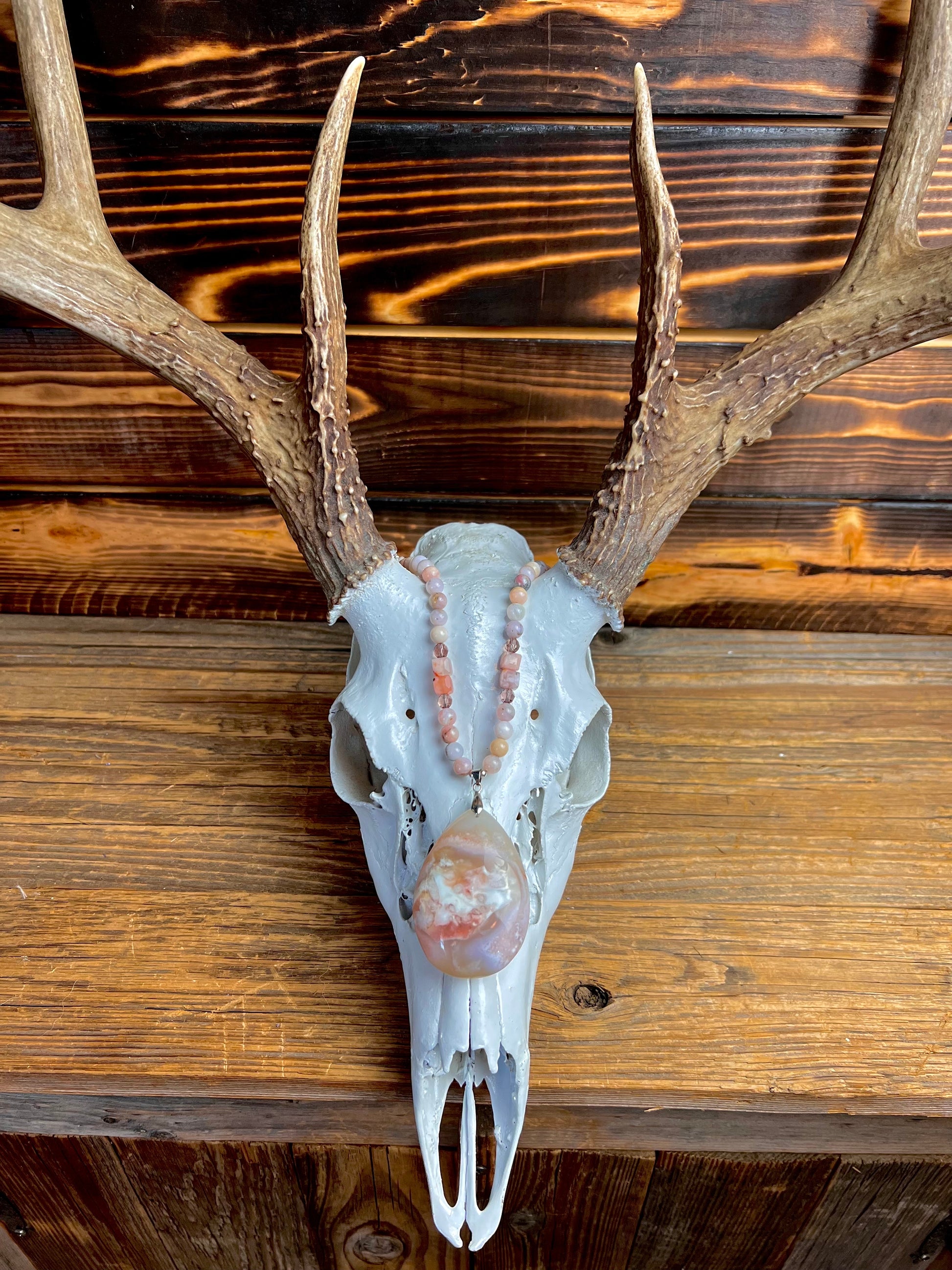 Flower agate polished beads with smoky Quartz accents complement a large polished tear drop shaped Pendant.